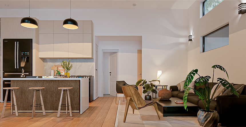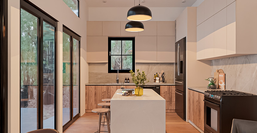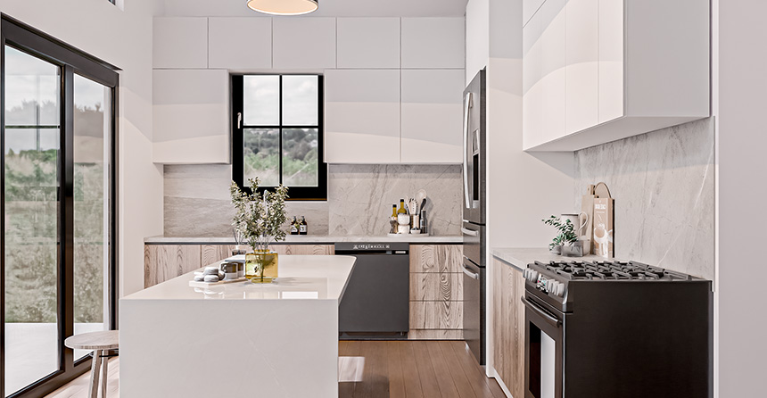 À l’intérieur, le Nova+ met en valeur une fluidité des espaces : une cuisine et un vivoir ouverts sur l’extérieur, une chambre avec walk-in sur mesure, une salle de bain optimisée et des rangements intelligents. Chaque détail est pensé pour offrir le confort d’une maison complète dans un format adapté aux terrains d’aujourd’hui.